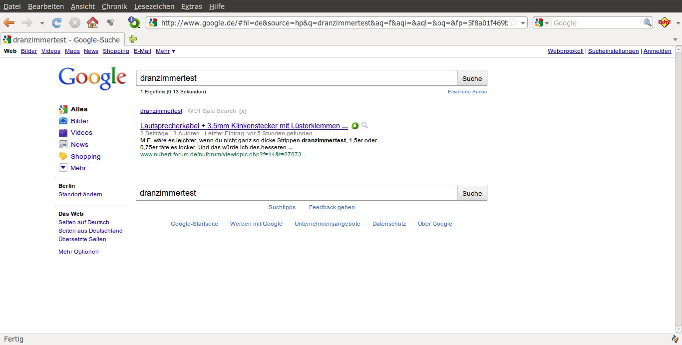 Hehe, das ist ja n Ding! Hab ich jetzt was gewonnen?ulli.dirks hat geschrieben:Dranzimmertest! Es gab mal so ein Google Spiel, wo man ein Wort bei Google eingab und auf möglichst wenig Funde erpicht war. Probier das mal mit " dranzimmertest" aus;).g.vogt hat geschrieben:Hallo Bud Spencer,
