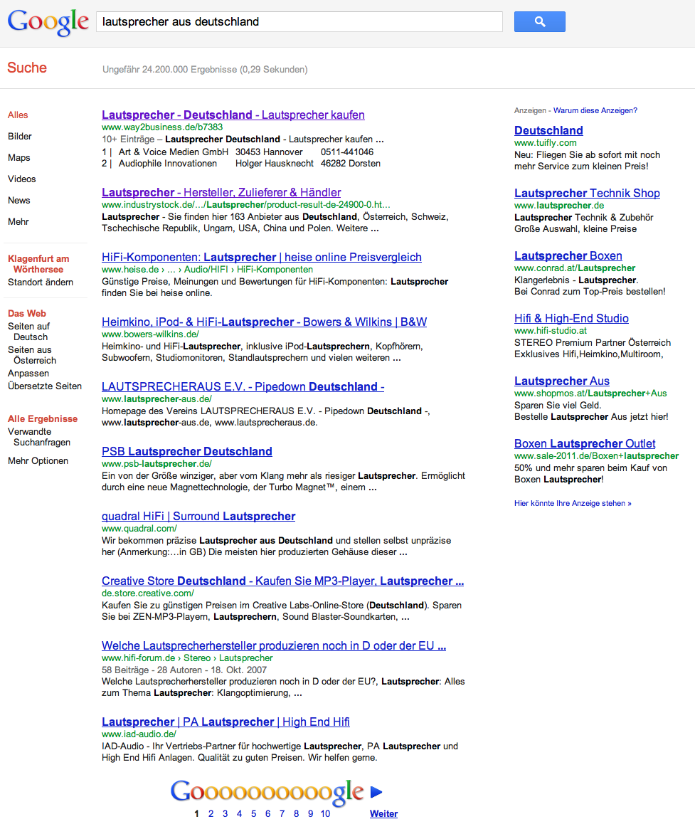 Nehmen wir an ich komme ganz spontan auf die verwegene Idee bei google nach "Lautsprecher aus Deutschland" zu suchen. Ich stelle nun fest, daß es Sie bei dieser Suche nicht gibt. Zumindest nicht auf den ersten 10 Treffern und nur um die geht es.