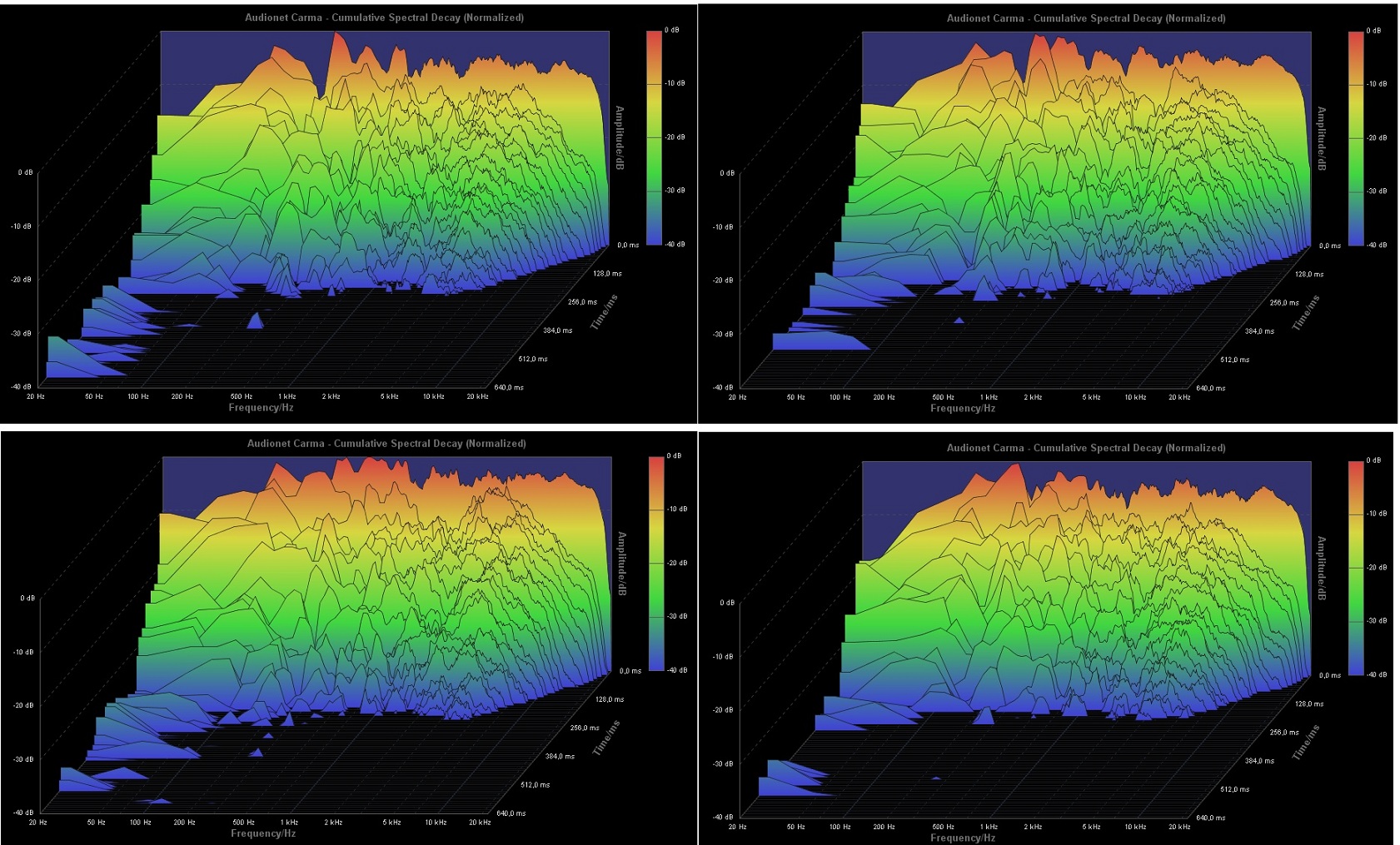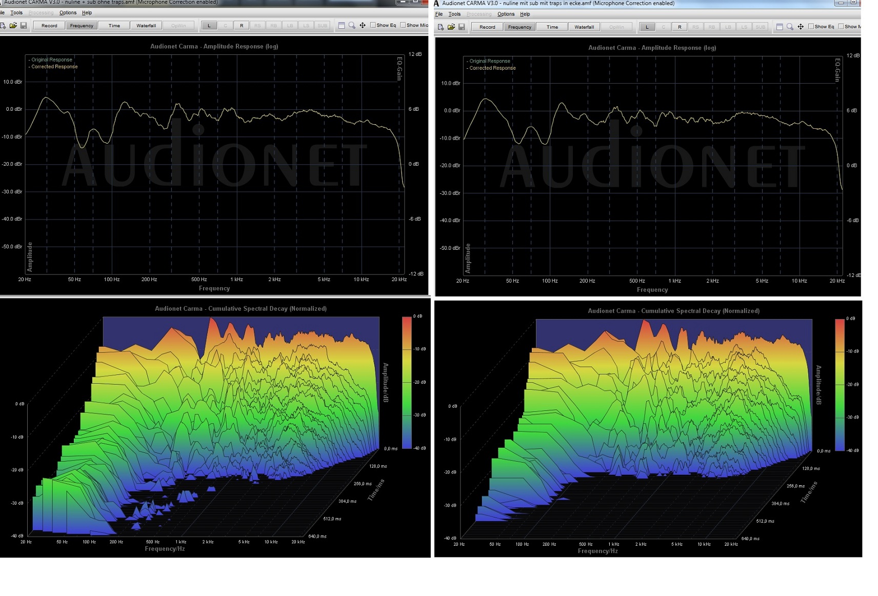 Interessanterweise zeigt der linke und rechte Kanal, unabhängig von den Basstraps, deutliche unterschiede in den Nachhallzeiten unter 100 Hz, besonders unter 50 Hz, obwohl der Subwoofer auf ca. 80 Hz Übernahmefrequenz eingestellt war und somit weder die linke noch die rechte Box diese Frequenzen überhaupt übertragen, v.a. die um 30 Hz, die eine große Nachhallzeit hat. Ich kann mir diesen reproduzierbaren Sachverhalt nicht erklären.