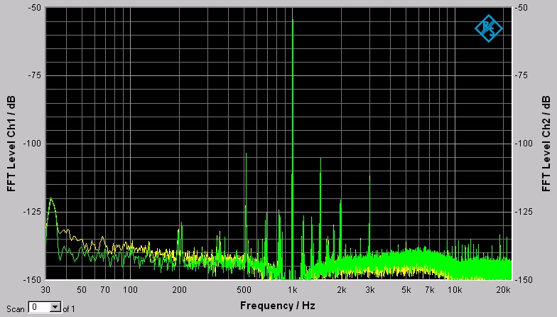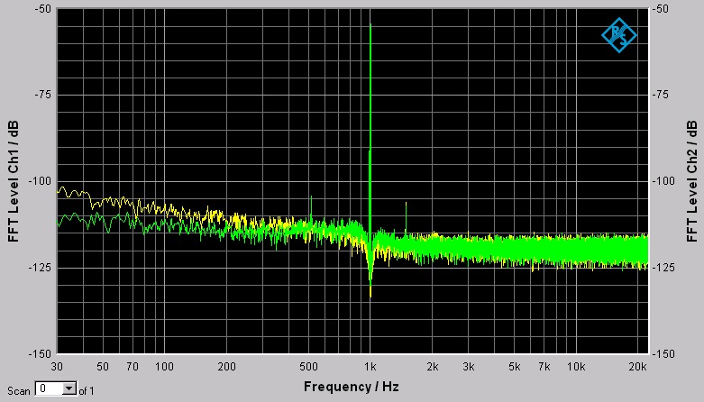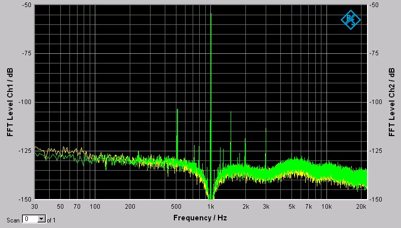 Ich habe eine SNR nach A Gewichtung von 119db gemessen. Die THD und THD+N werte sehen nicht so gut aus, da hier das Rauschen des UPV's zu Buche schlägt.