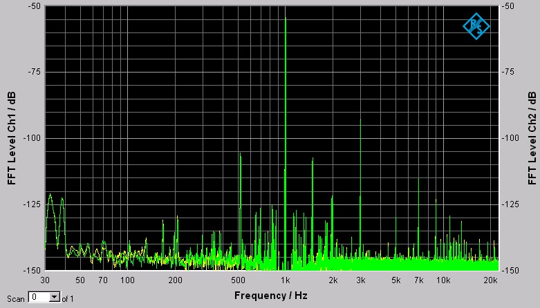 Bei Allen FFT's wurde die Fundamentalfrequenz (1Khz) durch den analogen Kerbfilter auf wesentlich niedrigere Pegel "gedrückt". Es wurde immer mit 200kOhm Eingangswiderstand gemessen, bis auf die eine +3db Messung
