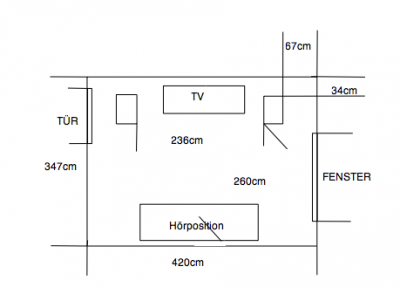 Ok also hier mal eine Skizze des Raumes. Sind ja doch nur 14,5m2 merke ich gerade. Ist natürlich schon klein für solche Lautsprecher, jedoch hatte ich schnon nupro a-20 und abacus a-box10 zum testen und auch bei solch kleinen Lautsprechern dröhnen die entsprechenden Bassfrequenzen nicht unbedingt weniger als bei den Großen.