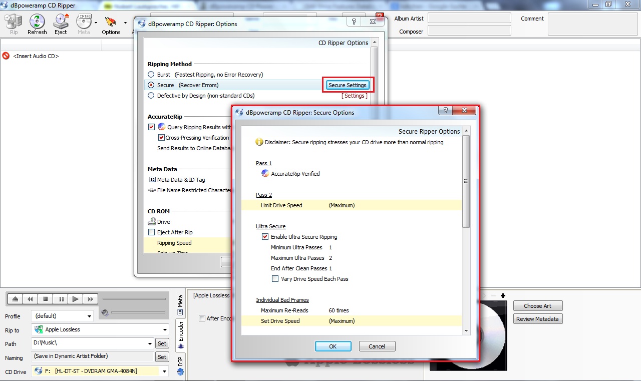 Die Ultra Secure Einstellungen sind abhängig vom verwendeten Laufwerk und dessen Fähigkeit C2 Errors ans Rip-Program zu melden, also das Laufwerk teilt dem Programm mit wenn es Lesefehler feststellt.