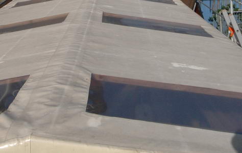 zu sehen ist seitlich eine Leiter und ein Gerüst. Das Dach ist recht schmal und flach geneigt, wie ein nachträglich angebrachtes Dach für einen Flachdachbungalow...