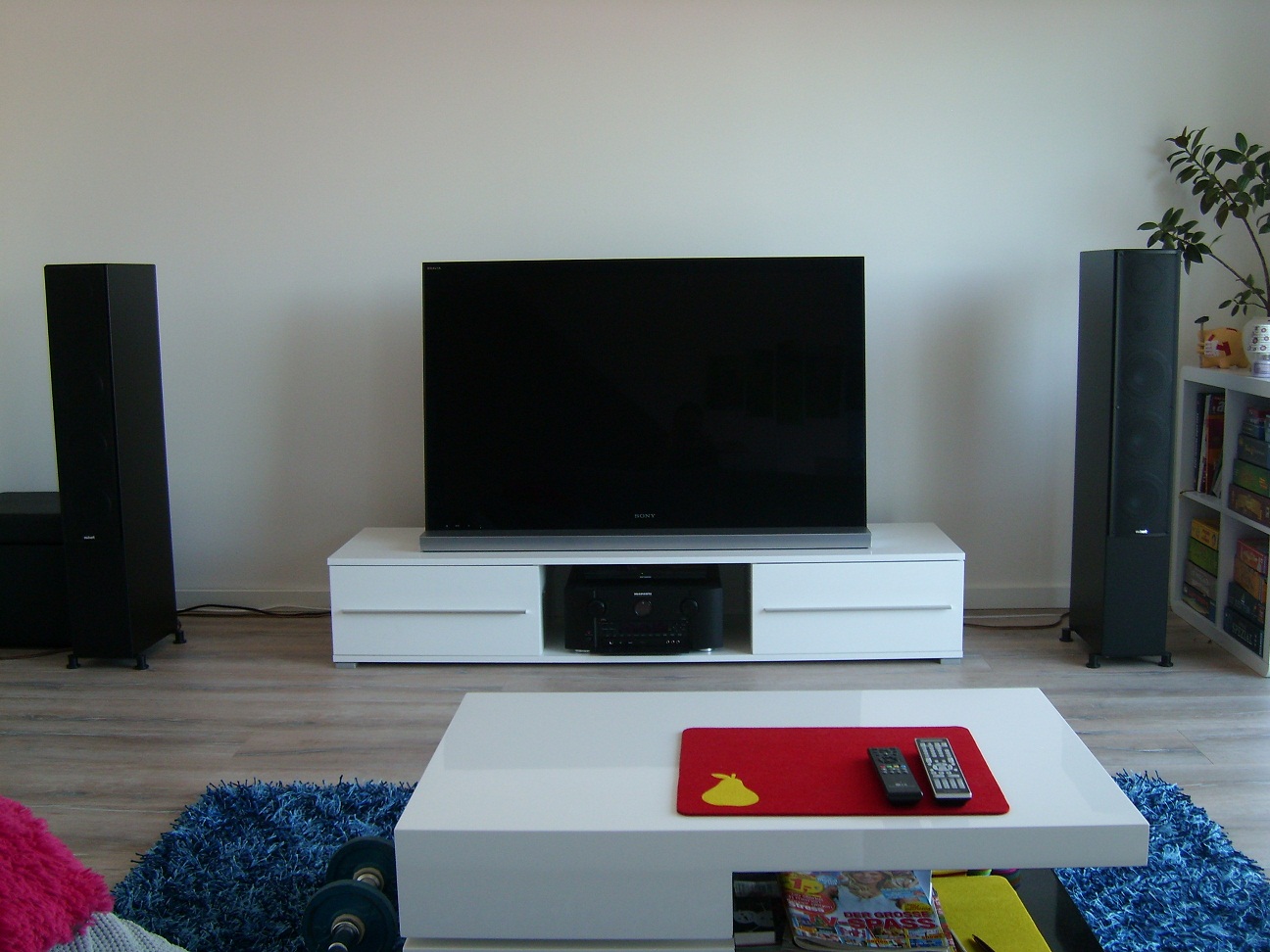 Die Lautsprecher stehen wandnah (40 cm zur Rückwand, 60 cm zur Seitenwand), da ich so ein bisschen mehr Bass erzielen kann (auch wenn der Bass vielleicht dröhnender ist als es sollte).