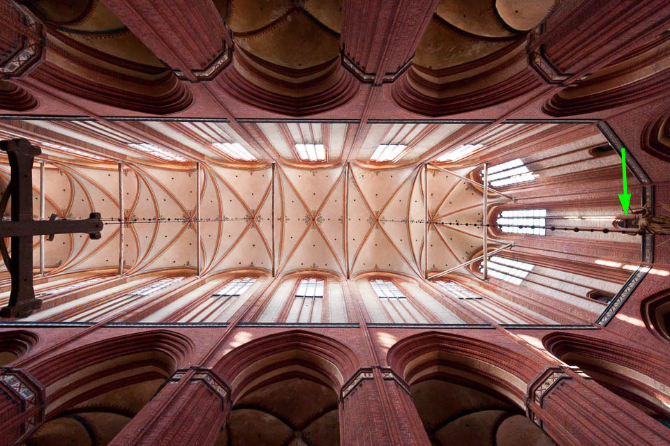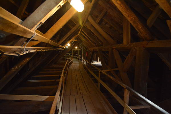 Unsere Führerin war Schülerin und erzählte uns einiges über die Bauweise. Das Gebälk konnten wir bis zur Wand hinten über dem Altar begehen. Dort befand sich ein Fester mit Panzerglas. Darüber war eine schmale Öffnung, durch die ich mein Objektiv geradeso durchkriegte und diese Bilder machen konnte.