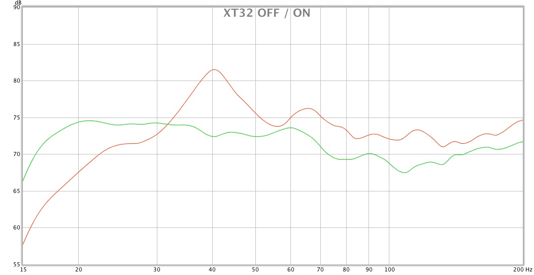 Auf dem Bild ist sehr gut zu erkennen das die Unterschiede zwischen OFF / ON nur minimal sind. Eine wirksame Korrektur findet überhaupt nicht statt. Zumindest nicht bei der kritischen Frequenz von 40 Hz. Da XT für den Subwoofer mehr "Filter" zur Verfügung hat und den in diesem Fall sehr gut korrigieren konnte, war die einzige Lösung des Problems, alle Frequenzen unterhalb von 60 Hz auf den Subwoofer umzuleiten. So konnte als "Kompromiss" der Klang weiter optimiert werden. Reines Stereo mit den Frontlautsprechern als FullBand war in dieser Konfiguration wegen des Dröhnens bei 40 Hz nicht möglich. Die nuLine 82 mussten daher "beschnitten" werden und ich könnte sie nie "pur" erleben.