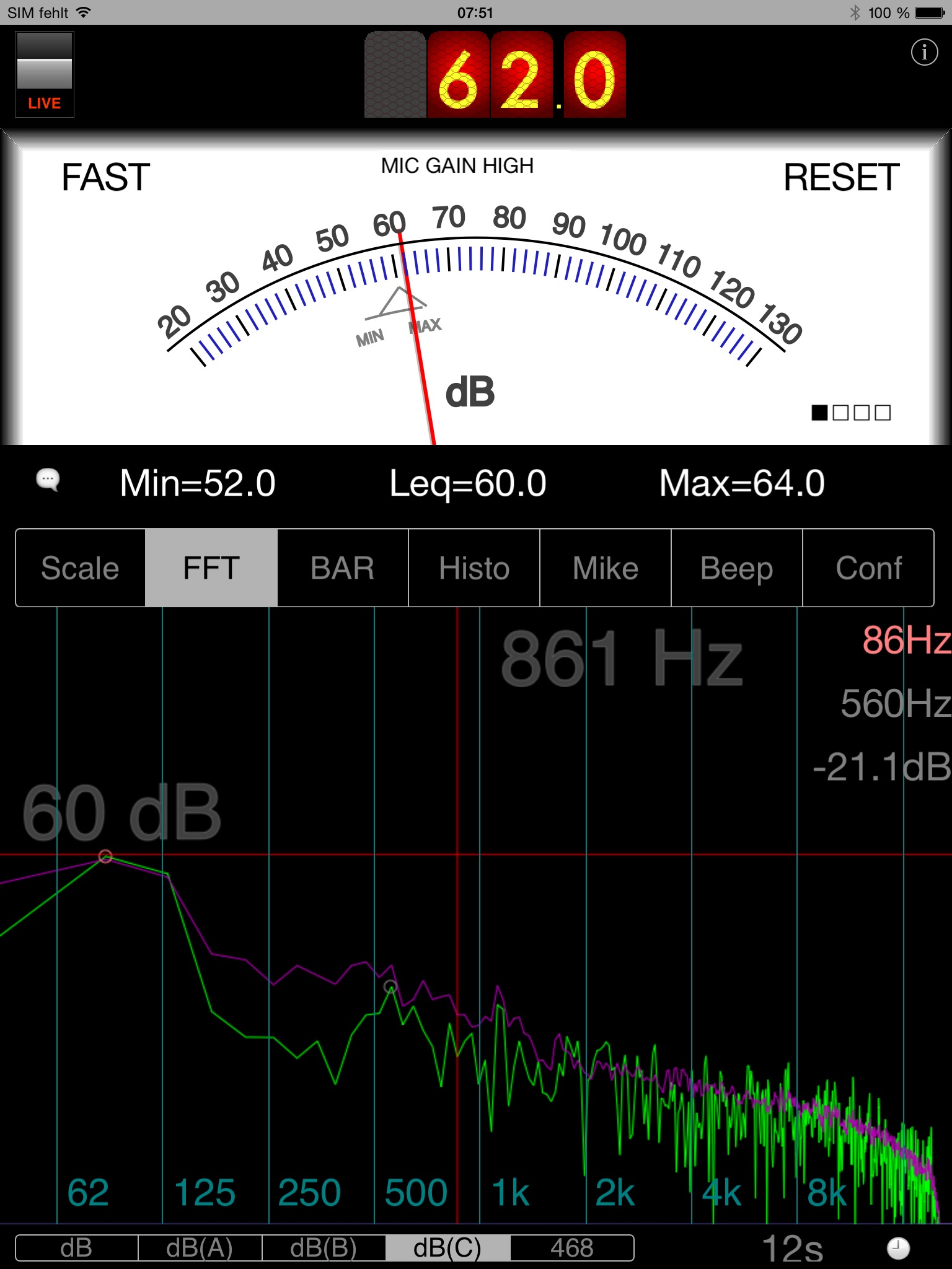 Ach ja, ich besitze auch kein Pegelmessgerät. Daher habe ich im Netz nach Apps für iOS gegoogelt und bin auf die App SPLnFFT gestoßen. Nach Tests soll das Mikro des iPhone direkt durch die App angesprochen werden und vernünftige Messergebnisse liefern. Den Pegel kann ich also "mehr oder weniger" genau bestimmen. So sieht das aus der App raus aus: