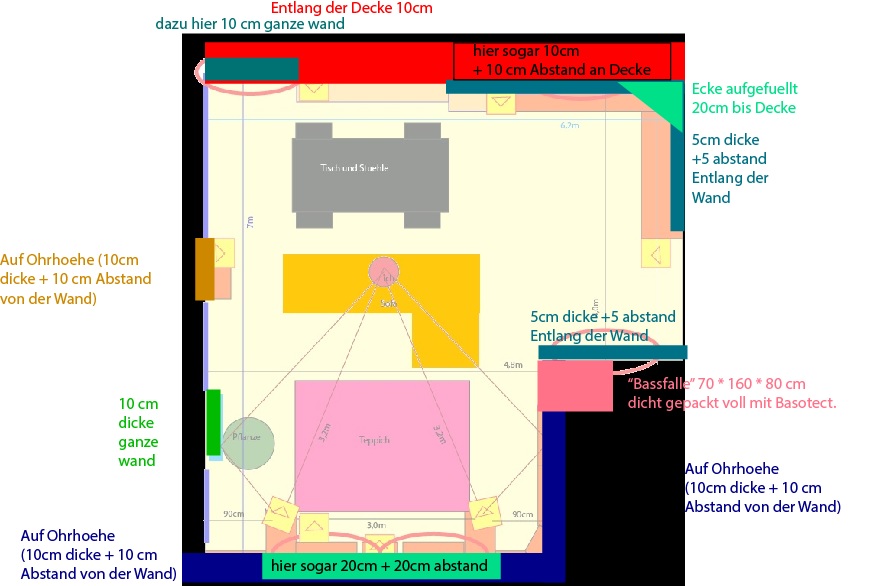 Allerdings habe ich mit 10 Absorbern 1,80 x 80 x 5 cm angefangen und habe eine solche Verbesserung gehoert, dass ich sofort nachgekauft habe - insgesamt sind nun grob etwa 50 Absorber mit 1,5 x 80 x 5 cm "verbaut".