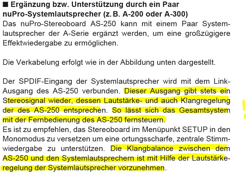 Jetzt stellt sich mir natürlich die Frage, wie ich das ganze evtl erweitern kann. Hat von euch jemand Erfahrung mit der nuPro AS-250 in Kombination eines Boxenpaares nuPro A-100 / A-200 / A-300?