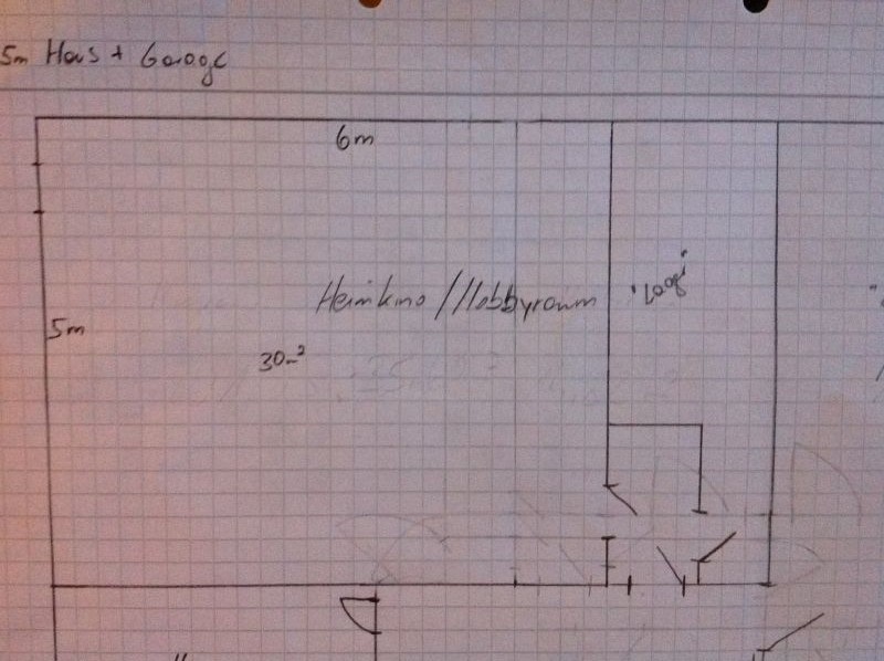 Ich habe mal eine Handgezeichnete Skizze vom Kino eingefügt. links würde die Leinwand hin kommen. Da kommt auch kein Fenster hin. Die Standort der Türen werden erst kurzfristig entschieden, wie die genau sein sollen, wobei der Zugang über das "Lager" sein soll. Der Flur im "lager" wird in Trockenbauweise hergestellt.
