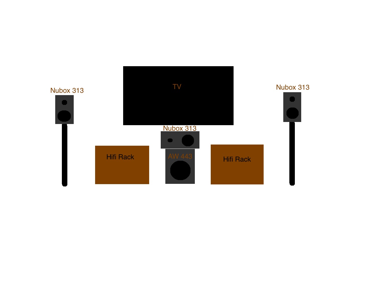 Aktuell habe ich nur den TV und ein Paar 313 auf Stativen an/vor der Hifi Wand. Als nächste Ergänzung würde ich gerne den Subwoofer und die 313 als Center kaufen und wie in der angehängten Grafik aufstellen (Abstand zwischen den beiden Racks 60cm, Standort Subwoofer)
