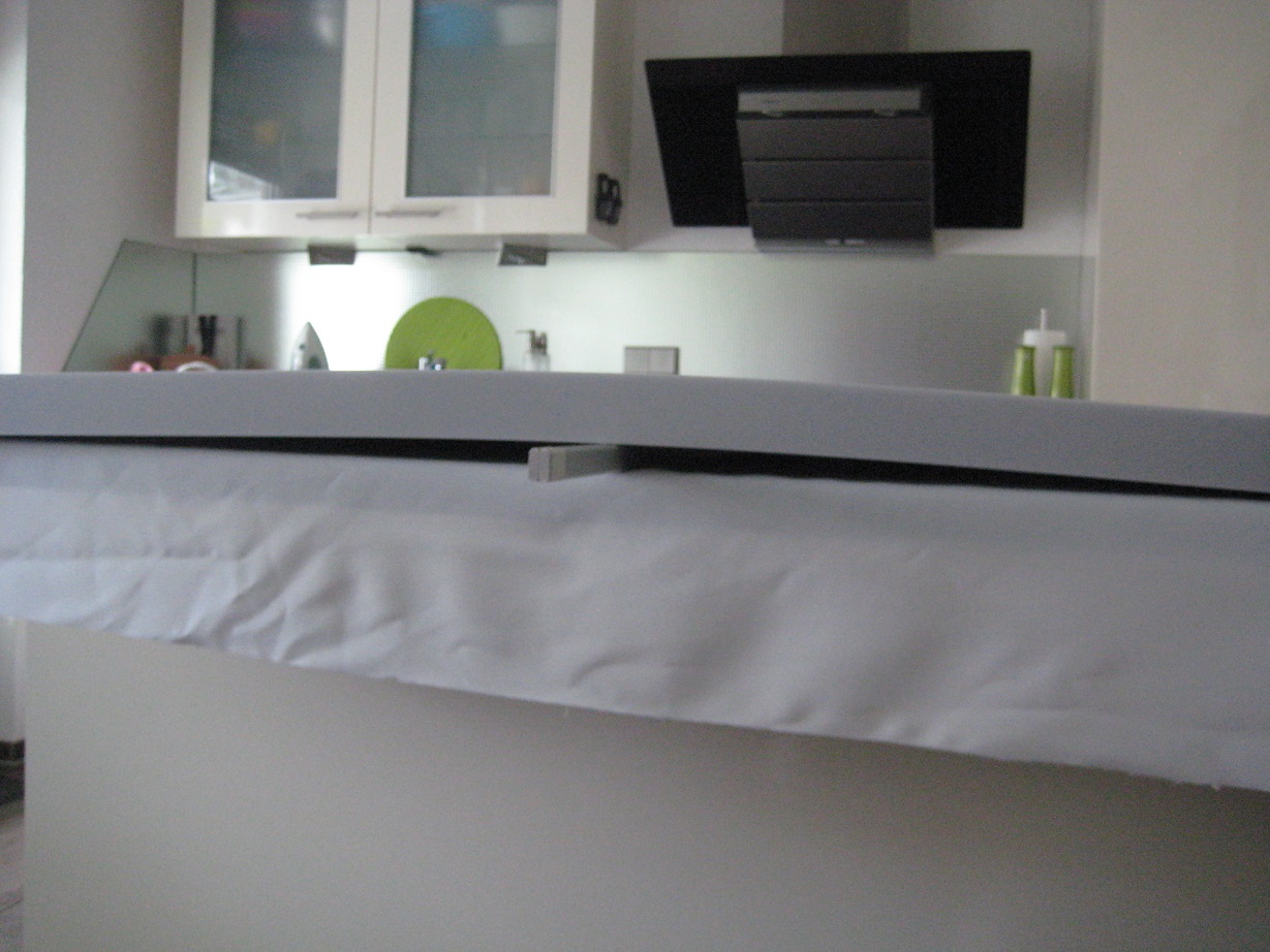 Um den Stoff auf max. Spannung zu bringen, habe ich den Absorber etwas "hohl" gelegt: Danach wurde der Stoff straff gespannt. Zuerst an den kurzen Seiten, dannach an den langen (dort ebenfalls den Absorber unter dem Stoff hohl auflegen)