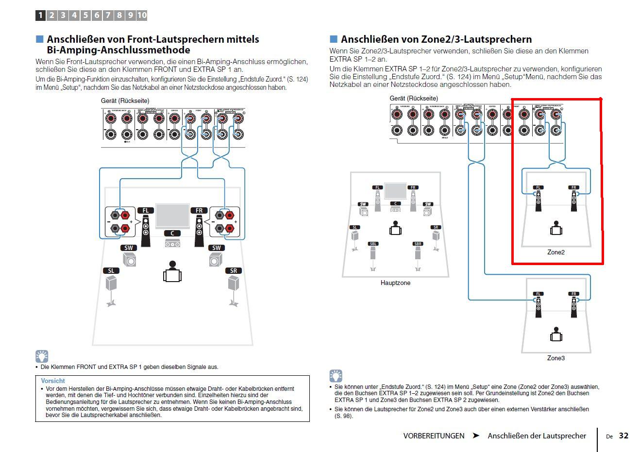 2. der Anschluss der FRONTLAUTSPRECHER erfolgt beim Zone2-Trick an die "EXTRA SP1" Lautsprecheranschlüsse (lt.BDA Seite 32):