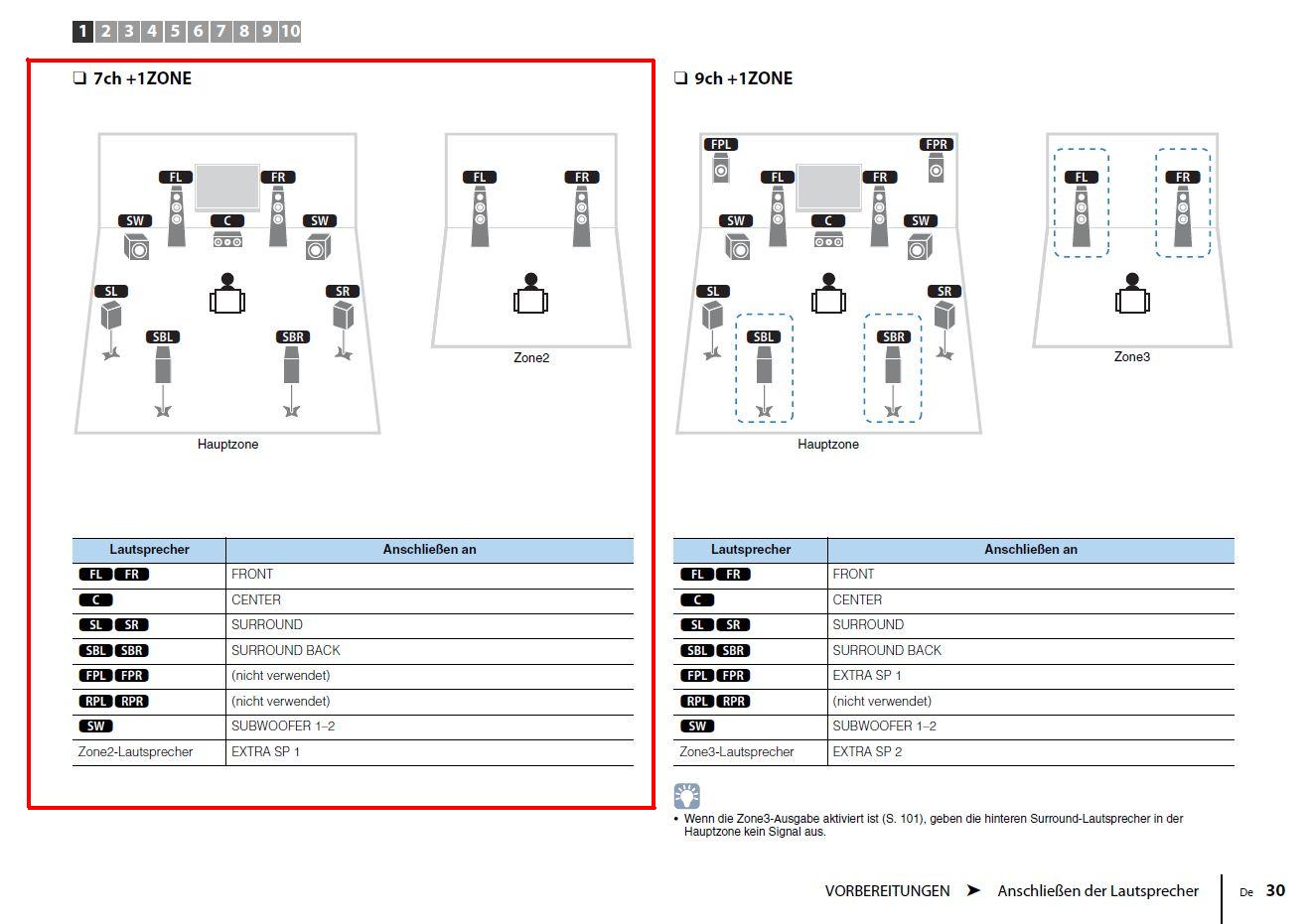 1. um bei dem 9Kanal-Verstärker "aktive Zone2" einzustellen (7Kanal-Setup bleibt in der Hauptzone erhalten) muss lt.BDA Seite 30 "7ch + 1ZONE" ausgewählt werden, denn damit erhält man(n) zusätzlich zur Hauptzone EINE weitere aktive Zone = "Zone2" , siehe: