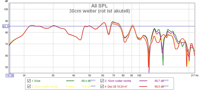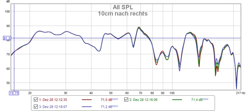 Nun werde ich den Subwoofer von der akutellen Position 10cm nach vorne ziehen und dann in 10cm Schritten wieder zurück zur linken Seitenwand wandern, dann sollte man beobachten können, wie die Senke wieder deutlich unter 100hz wandert