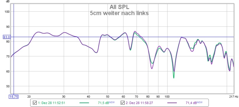 5cm nach rechts (die Senke bei 80hz wird wieder tiefer, scheint so als ob die Achse 10cm von Frontwand günstiger wäre, aber weiter im Takt)