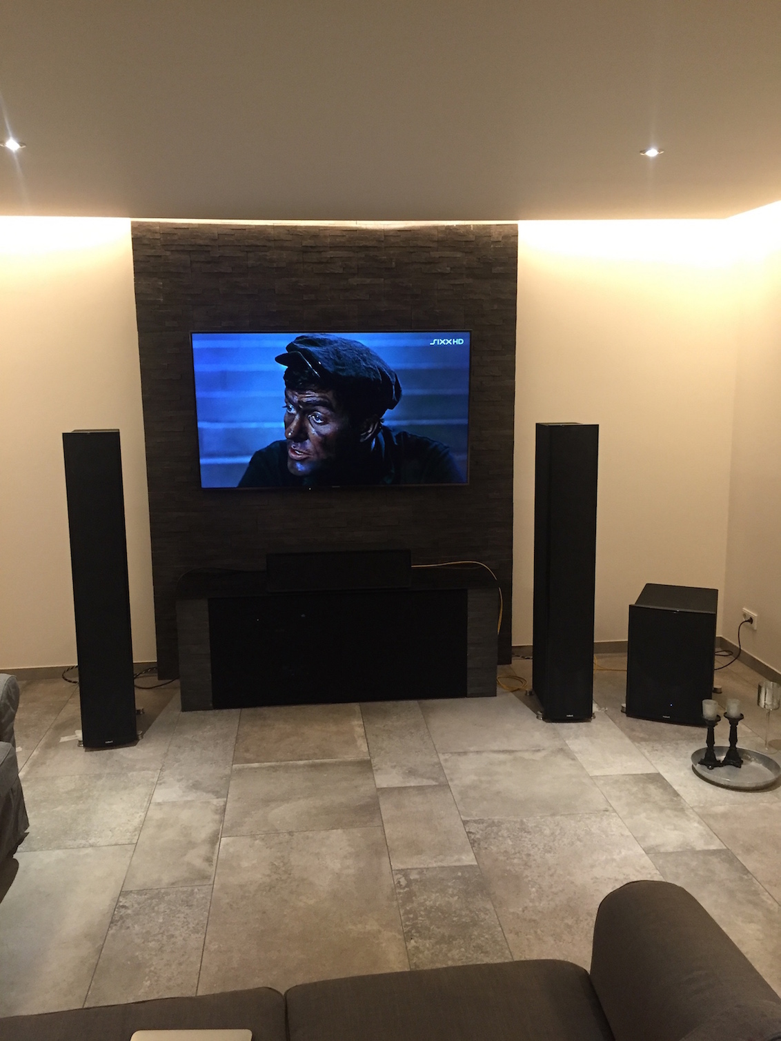 Rechts und links dann zwei kleine Sub neben das "Mittelpodest" und die selben auf die Rückseite des Raumes. Die beiden hinten Subs können dann auch hinter oder neben dem Sofa aufgestellt werden.
