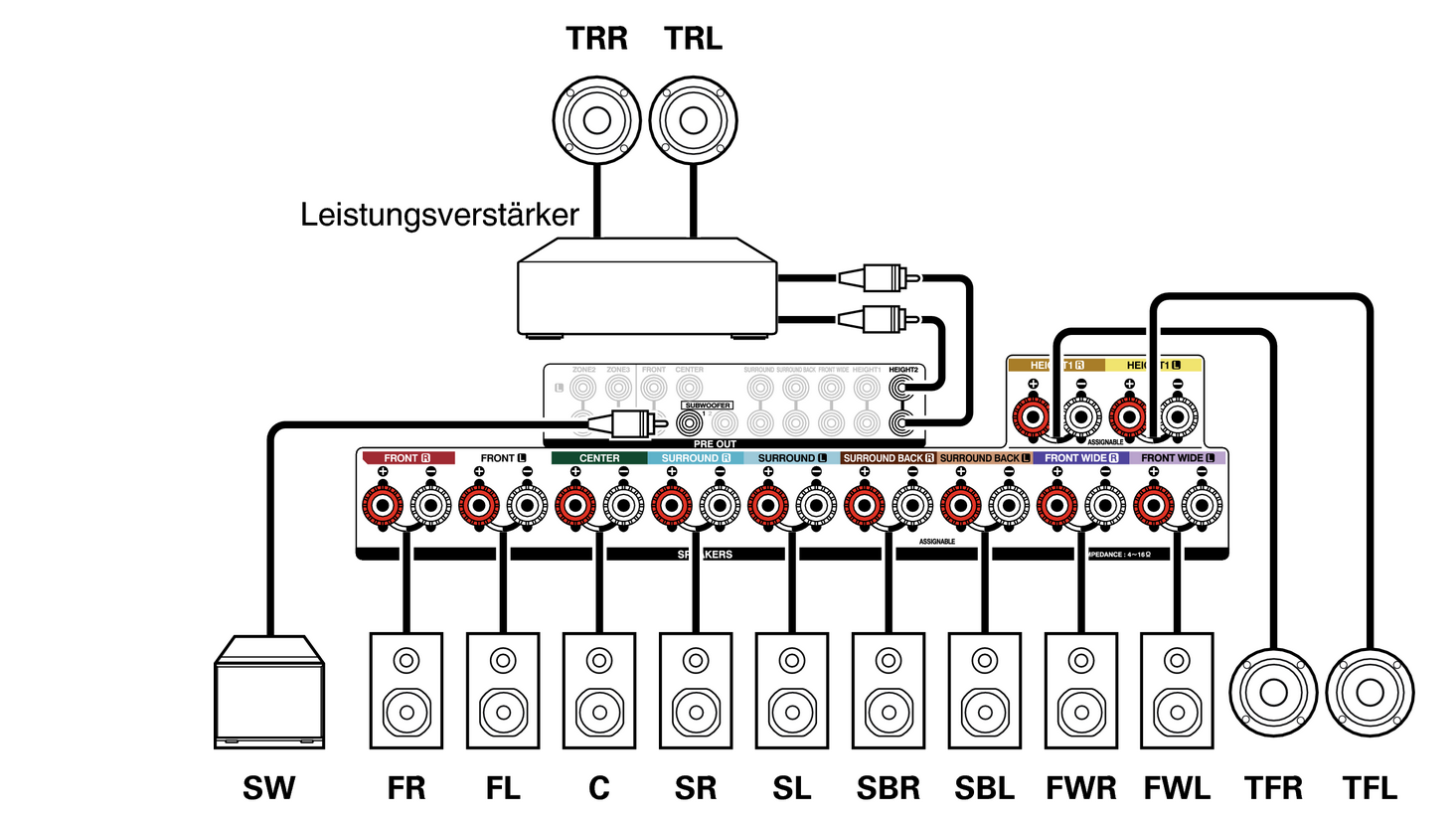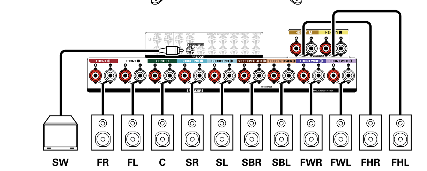 Du kannst über die Pre Outs maximal 11.2 Kanäle ansteuern.