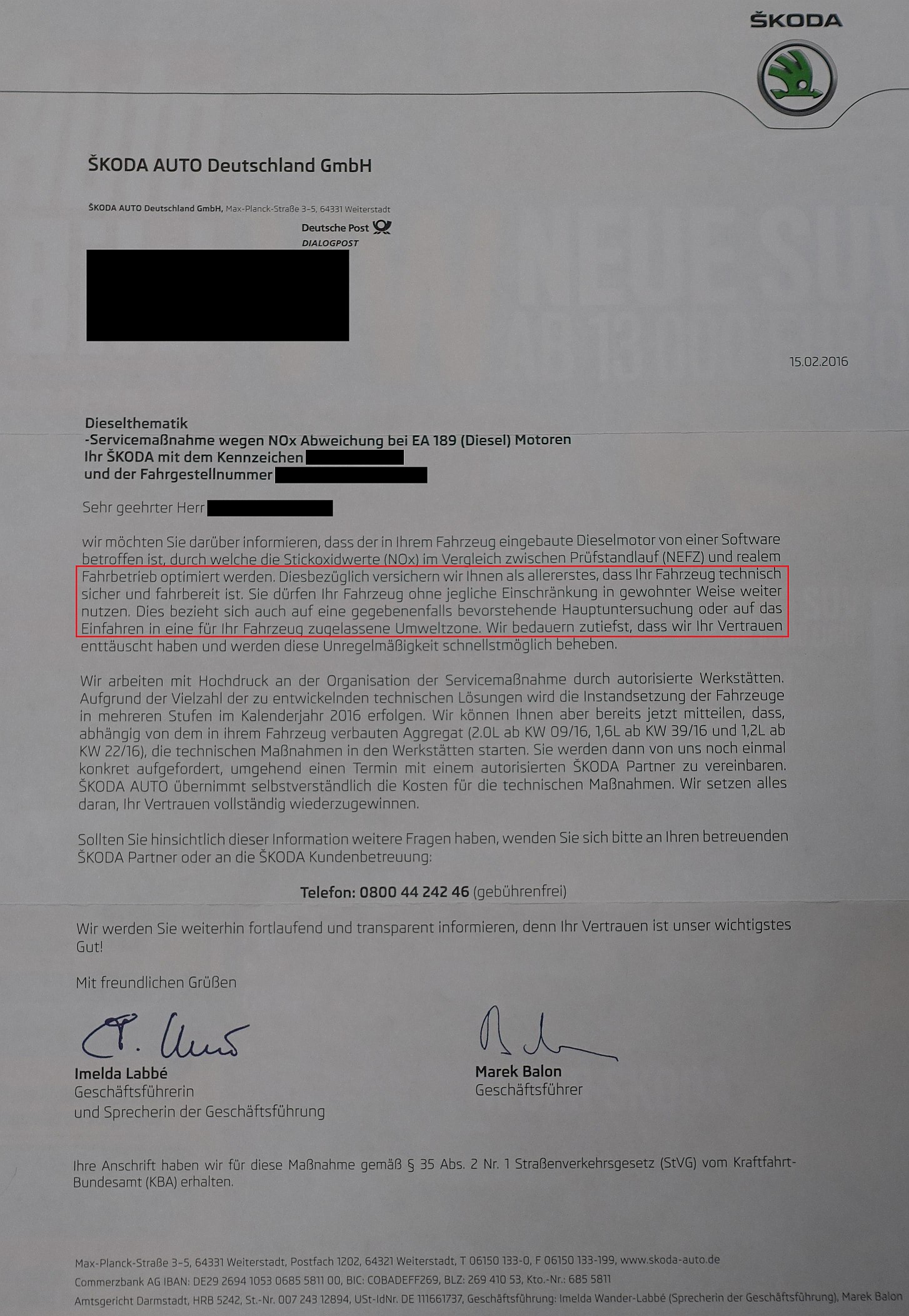 Es könnte aber auch sein, dass dieses "sie dürfen weiterfahren" nur für einen Übergangszeitraum gemeint ist, den das KBA für die Nachbesserung eingeräumt hatte - das lässt das Schreiben offen. Anwaltssprech: Interessant ist, was Skoda/VW NICHT schreibt.