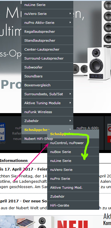 Das scheint aber nur beim Menüpunkt Schnäppchen so zu sein und es betrifft nur die beiden obersten Einträge in dem Untermenü. Dort scheint sich der Menüpunkt nubert HiFi-shop nach vorn zu drängeln. Ab dem Punkt NuBox-Serie im Schnäppchen Untermenü verhält sich alles wieder normal.