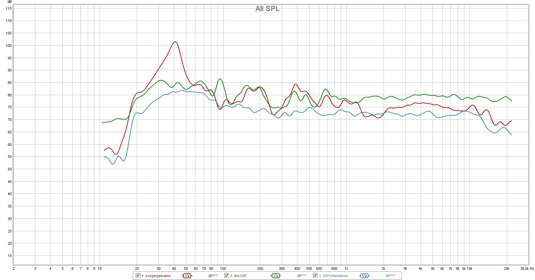 Wenn du mal ein realistisches Bild bekommen möchtest. stell mal auf var. smoothing, bei 1/6 wird der Bass meiner Meinung deutlich zu stark geglättet. REW bietet in Kombination mit dem MiniDSP eine auto EQ Funktion, viel muss man da manuell eigentlich nicht mehr machen.