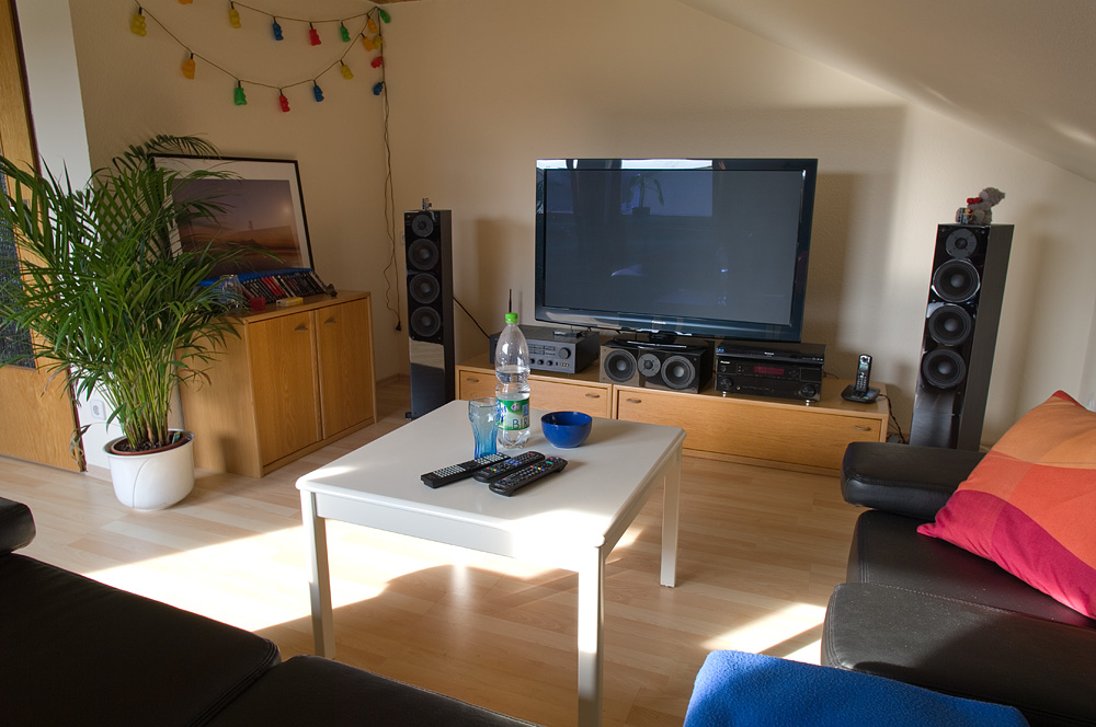 Das sieht zwar etwas seltsam aus, aber ich denke, das ist nur Gewöhnungssache. Muss jetzt nur noch gucken, dass ich den Fernseher samt Schubladen (damit der weiterhin auf den Seitenwänden steht - sonst biegen sich die oberen Bretter zu sehr durch) weiter in die Mitte rücke. Dadurch wird dann auch der Abstand beider Frontlautsprecher zum Center gleichmäßiger und ich schaffe auf der linken Seite mehr Luft.
