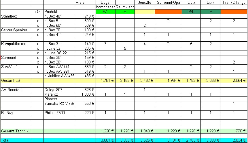 Dann fünf nuBox 311 und zwei aw441 bzw 991HerzD hat geschrieben:Zum Start wird es wohl eine 5.1 Variante mit der Denkrichtung von FrankOTango.