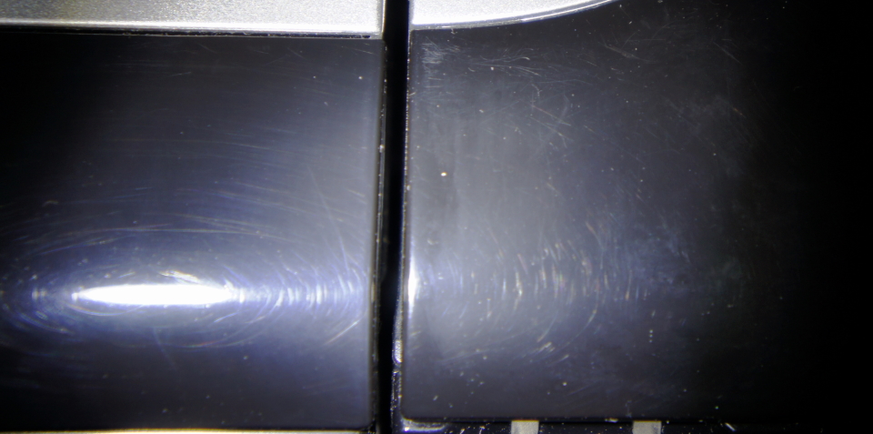 OK hier mal Bilder linke Seite poliert, rechte nur sauber gemacht. Letztes Bild mit erhöhtem Kontrast. OK nicht ganz perfekt, aber schon um einiges besser - denke mit Autolackpolitur gehts auch nicht arg viel besser. Habs erstmal am Drucker ausprobiert, der hat sicher mehr Kratzer als ne Box die man nur mal staubwischt, weil ich da auch ab und zu Unterlagen draufliegen habe.