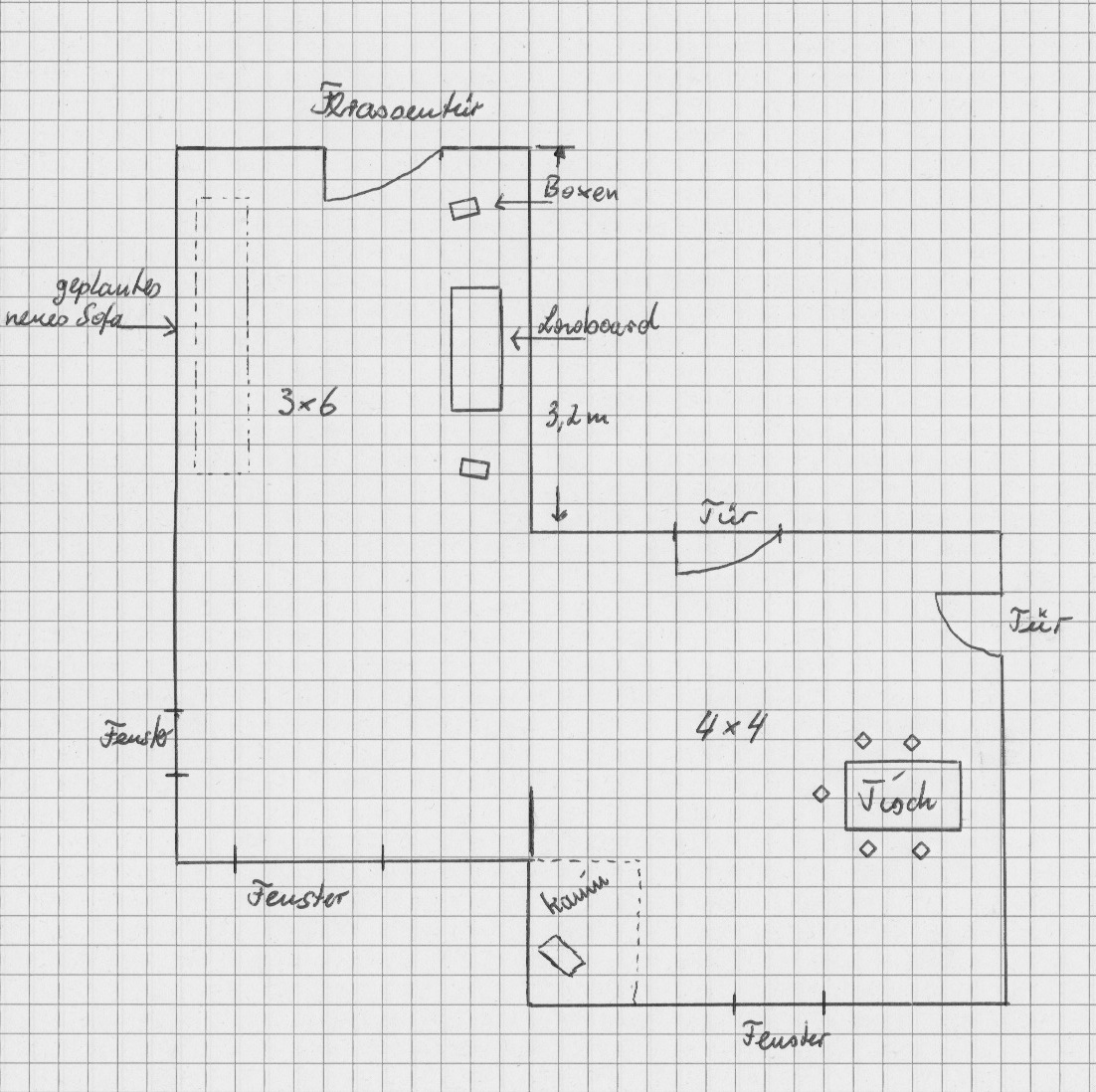 melde mich aus dem Bereitschaftsdienst zurück. Ich habe eine kleine Draufsicht des Wohnbereiches gezeichnet um den gesamten Raum vielleicht besser darzustellen. Vielen Dank für die ersten Antworten. Ich weiß, das das Highboard gerade im Bereich der rechten Box für Probleme sorgt. Ich habe die Box deshalb schon soweit wie möglich von der Rückwand weg und nach innen in den Raum reingedreht. Leider geht es nicht weiter, da die Tür im Weg ist. Ein Wechsel in den anderen Bereich ist auch schwer möglich, da dort der Kamin steht und die Aufstellfläche fehlt.Also alles nicht so einfach.Da hat man schon das eigene Haus und trotzdem Probleme die Anlage optimal hinzustellen.Am besten neues Haus und das dann um die Anlage rumbauen.!