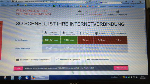 (die Messungen bewegen sich überwiegend im 70-100Mbps Bereich, je nach Tageszeit)