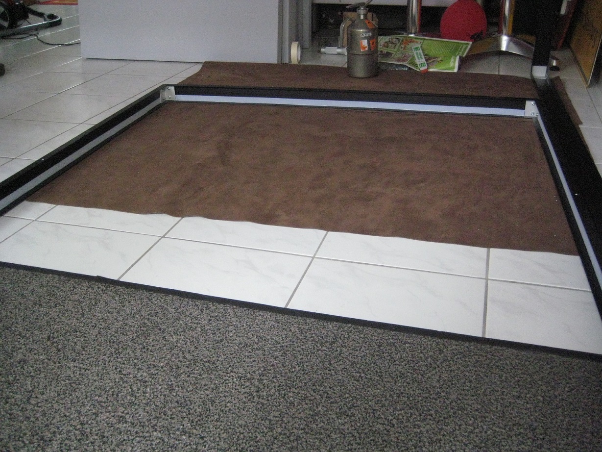 In unserer Firma haben wir selbstklebendes Klettband, das klebt wie die Sau. Daran hängen wir z.T. sehr schwere Stoffe auf... Das Ganze wird jetzt rund herum in den Rahmen eingeklebt, um später den Stoff daran zu befestigen: Der Stoff wurde von mir mithilfe eines Laser-Schneidetisches auf Maß genau geschnitten, und die Ränder wurden mit Flauschband ausgestattet.