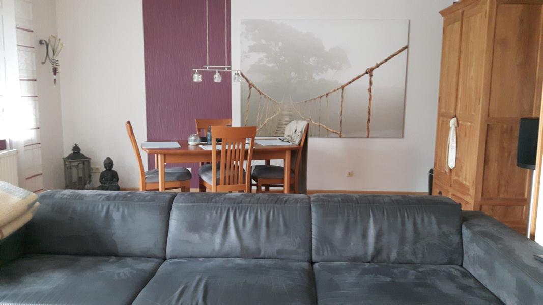 So da sind Bilder einmal nach hinten raus (da sieht man z.B. unter dem einen Bild einen der beiden hinteren Lautsprecheranschlüsse und rechts einen Surround-LS) und einmal nach vorne. Von der Sitzposition nach hinten sind es ca. 3,4m und nach vorne 3m.