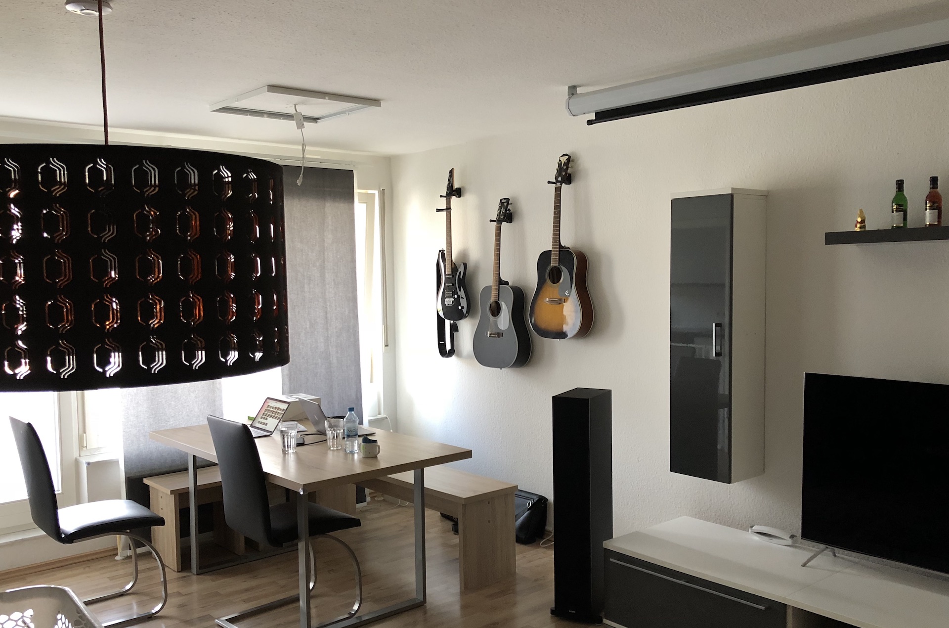 @all: Vielen herzlichen Dank für die Unterstützung und Tipps. Wie ihr auf dem hinzugefügten Bild sehen könnt, geht es in der Essecke geradewegs weiter mit der Schallhärte. Wenn man lauter spricht, dann hallt es durch die Gitarren noch stärker. Vermutlich hängen wir die Gitarren ab und ersetzen sie durch Absorber.