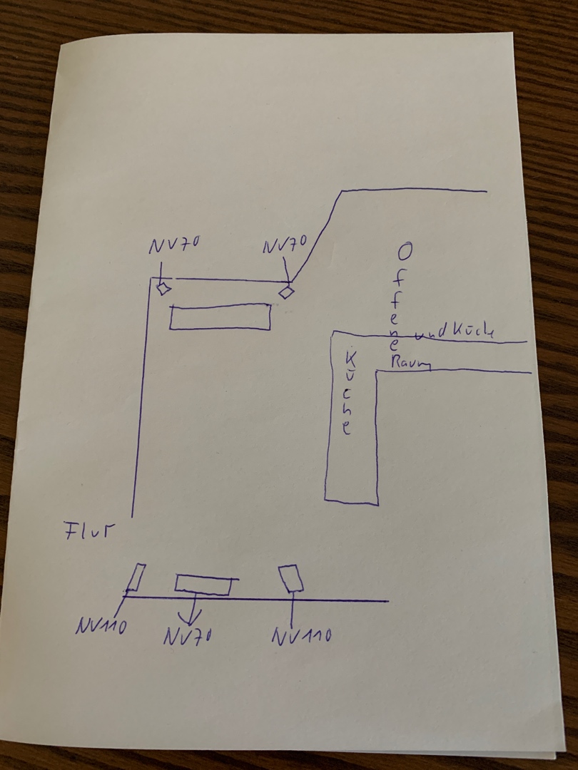 wenn ich die Skizze richtig interpretiere, ist dort ein offener Flur bzw. offener Wohn-/Küchenbereich?! Wie groß ist das Zimmer generell? Wie viel Abstand hat deine NV110 von der Rückwand zur Wand? Wenn die Skizze stimmt, hast du nur 5cm. Da sollten mind. 20cm sein! Wie weit ist das Sofa entfernt? 5m?