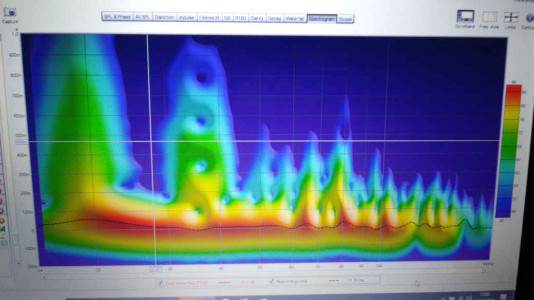 @ Andy RTR, wie oben beschrieben, die anfänglichen Messungen habe ich nicht. Nur was ich nachher mit dem DDRC88 per PEQs und nachher mit Dirac gebastelt habe. Frequenzgänge, Wasserfall etc ist natürlich extrem raumabhängig und habe ich mir schön linear mit leichter Rampe hingebogen. Ab 20Hz bis 100Hz ziemlich linear mit ca 5dB Abfall. Spectrogramm hätte ich auf dem Handy und ist angehängt. Da mein WoZi mit 42qm recht gross ist, ist natürlich auch der Nachhall entsprechend, da hilft auch mein 5qm Deckensegel nicht. Aber wer will sich im WoZi schon riesige Bassfallen oder Absorber hinstellen...