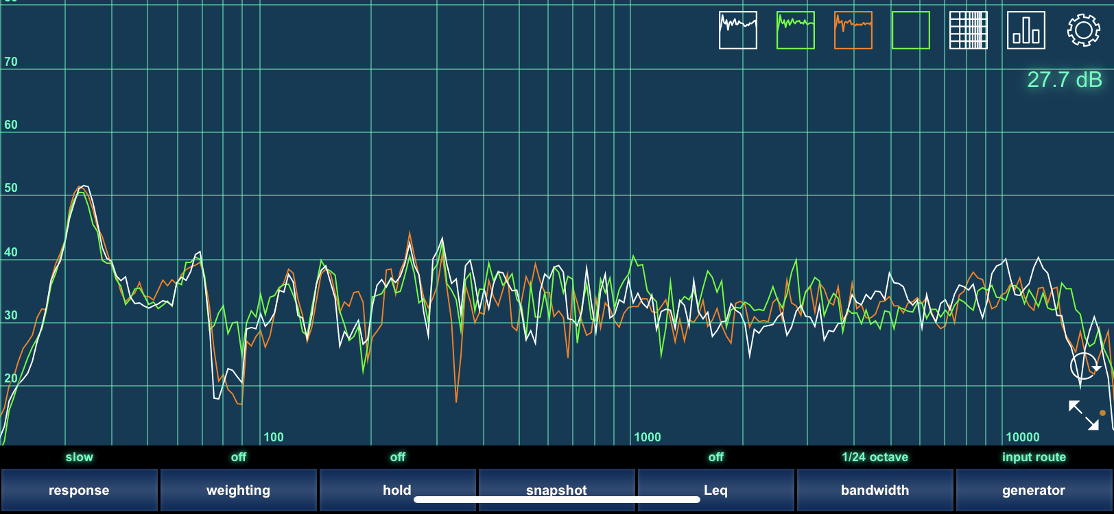 Was mir auffällt: abgesehen von dem "Hauptproblem" bei 33 Hz wandern die Täler und Berge wild herum. Aus dem Einbruch bei 85Hz wird durch 1m Vorrücken ein kräftiger Einbruch zwischen 50-60Hz (rote Kurve). Da frag' ich mich was macht das XT32? Stimmt es auf eine Mikrofonposition ab (Hörplatz)? Dann werden etliche anderen Stellen im Raum sicher verschlechtert. Oder wandert man mit dem Mikro herum und mittelt über die Messwerte? (und korrigiert nur maßvoll extreme Probleme wie das bei 33 Hz).