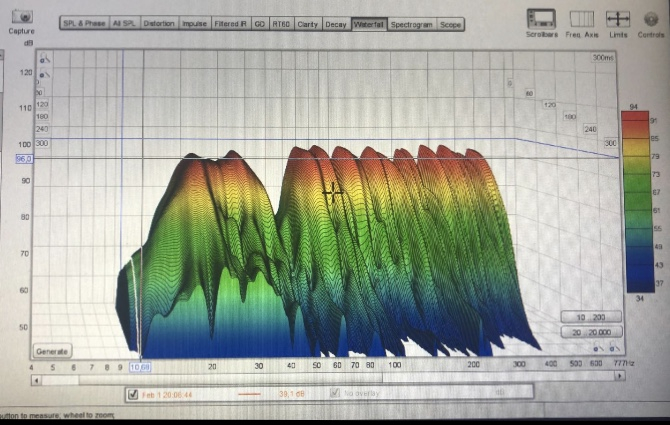 zur Eingangsmessung ohne dyn. EQ und ohne Subwoofer habe ich nun noch die RT-Messung und Wasserfalldiagramm gemacht.