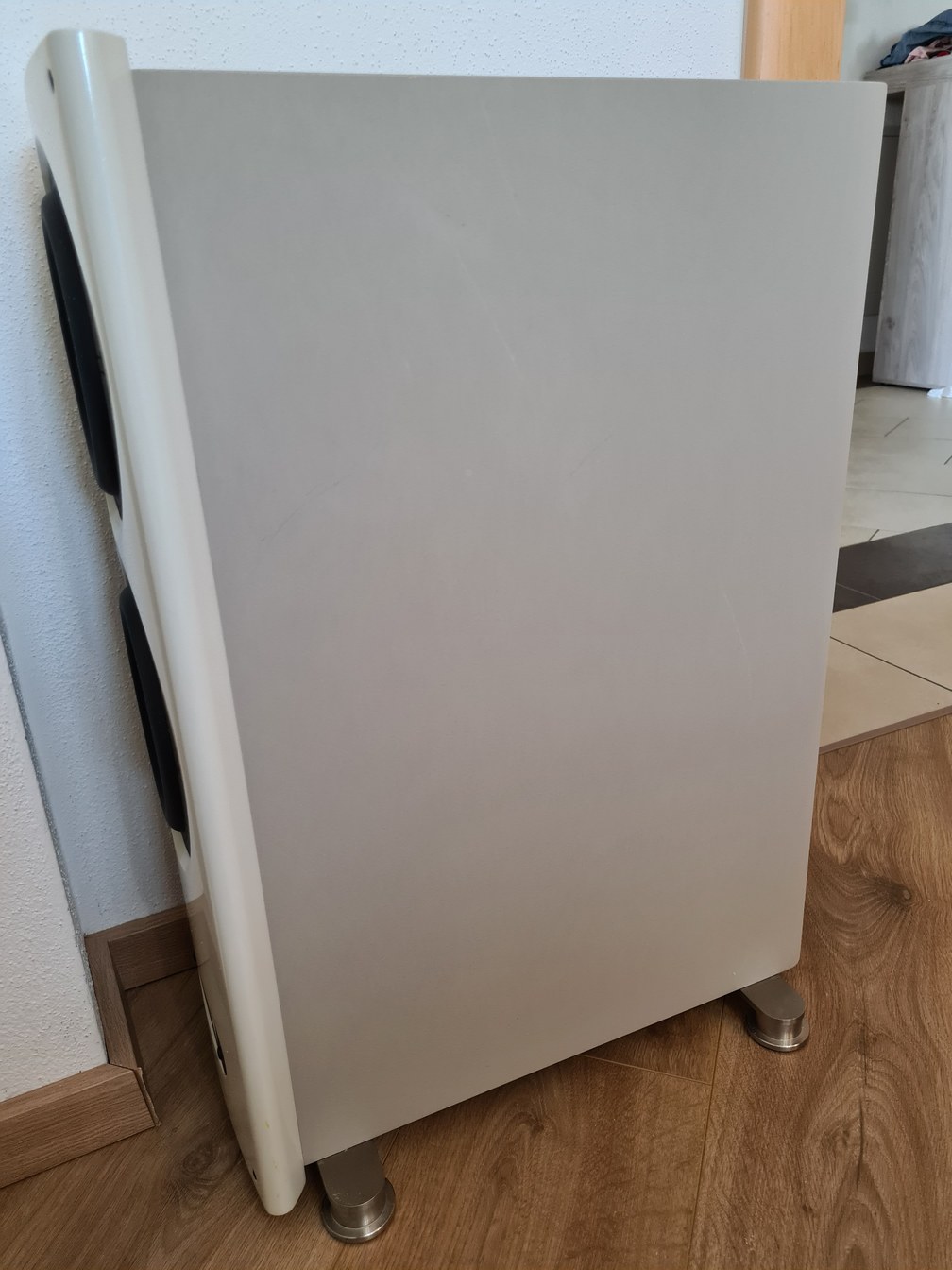 Ich würde den Reinigungsvorgang zunächst an einer unauffälligen Stelle probieren. Hierzu würde ich den Lautsprecher umdrehen, so dass die Unterseite mit den Standfüßen oben ist. Dort sollte sich ebenfalls die Nextel-Oberfläche befinden.