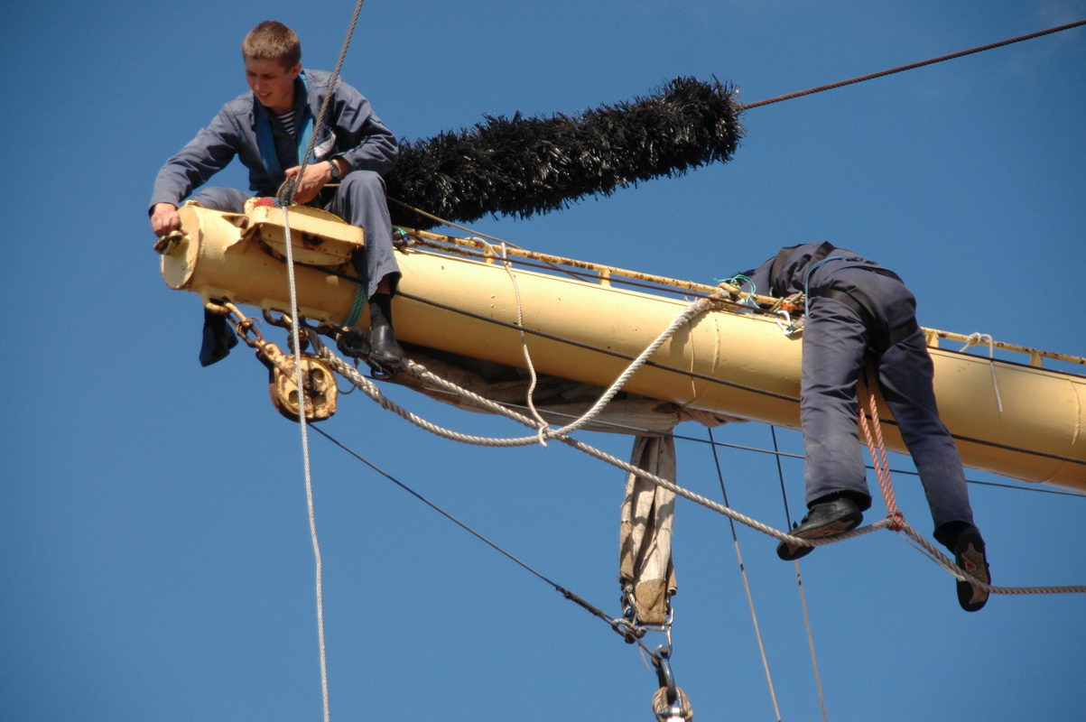 Man sieht eine Takelage mit Tausendfüßler zum Schutz der Segel vor Aufscheuern und einen Seemann.