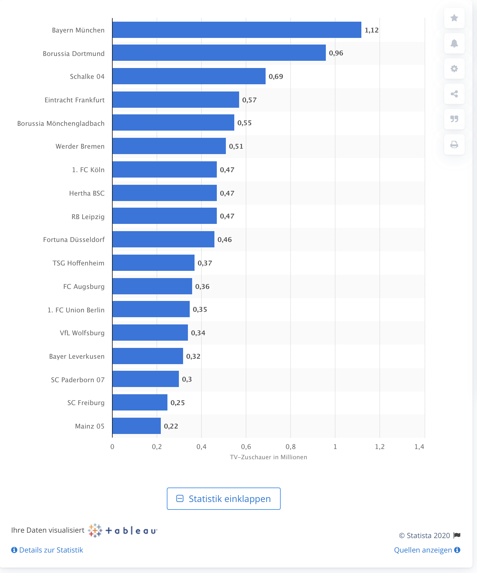 Passend dazu das Quotenmeter der Saison 2019/2020. Die Angaben sind der Durchschnitt pro Spieltag in Millionen Zuschauer. Ich finde, da ist schon die eine oder andere Überraschung dabei.Venuspower hat geschrieben:Das war natürlich etwas überspitzt dargestellt.Weyoun hat geschrieben:Warum soll ich es mir antun, wenn Bayern wöchentlich seine Gegener quält und 5:0 abwatscht? Ich würde nur die zwei Bayernspiele schauen wollen, diegegen "meinen" Club stattfinden.