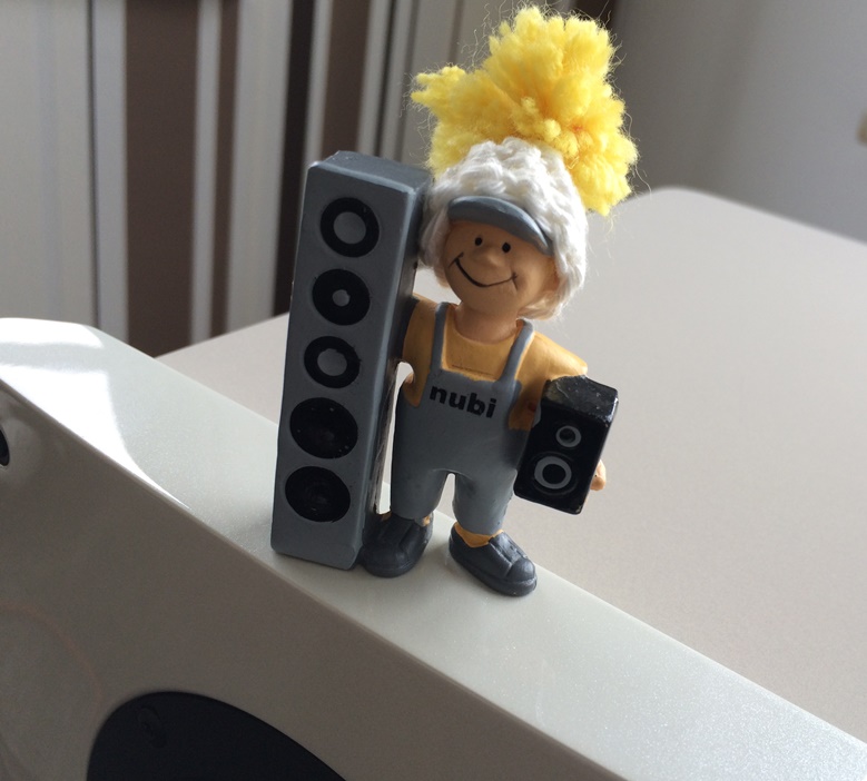 So, dann kommt hier mal mein Nubi... der hat allerdings "noch" ne weiße Prototypen-Mütze. Passend zum Nubert CI bekommt er auch noch eine schwarze Mütze