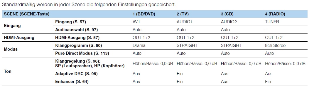 Also praktisch alles, was denkbar ist. Eine Scene ist was anderes. Bei einer Scene kannst du für jede Quelle (Also BluRay-Player, Sat-Receiver, Playstation, Tuner was auch immer) folgendes einstellen (Quelle ist die Yamaha Bedienungsanleitung!)