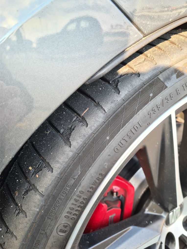 Ich füge mal ein Bild bei, wie er danach ausgesehen hat. Ich hätte von einem Sportreifen eines Markenherstellers deutlich mehr erwartet. Zum Vergleich ein Bild eines Michelin Pilot Sport 4S, mit dessen Besitzer ich mich auf dem Parkplatz noch ein wenig ausgetauscht habe. Ich rede hier übrigens nicht vom Unterschied bei der Profiltiefe, der ist altersbedingt, sondern den "Löchern" in meinen Contis. Sowas darf meiner Meinung nach nicht passieren.