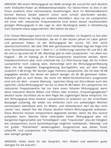 Da ich ihn auch privat kenne und wir regelmäßig Kontakt haben, weiß ich, wovon ich spreche. Außerdem weiß ich, mit welcher Akribie er Lautsprecher entwickelt (ich war schon nächtelang mit ihm im Labor, er besitzt ein unglaubliches Durchhaltevermögen wenn er seine Sweeps durch die Boxen und Weichen schickt und dabei noch die Frequenzverläufe bewertet und optimiert).