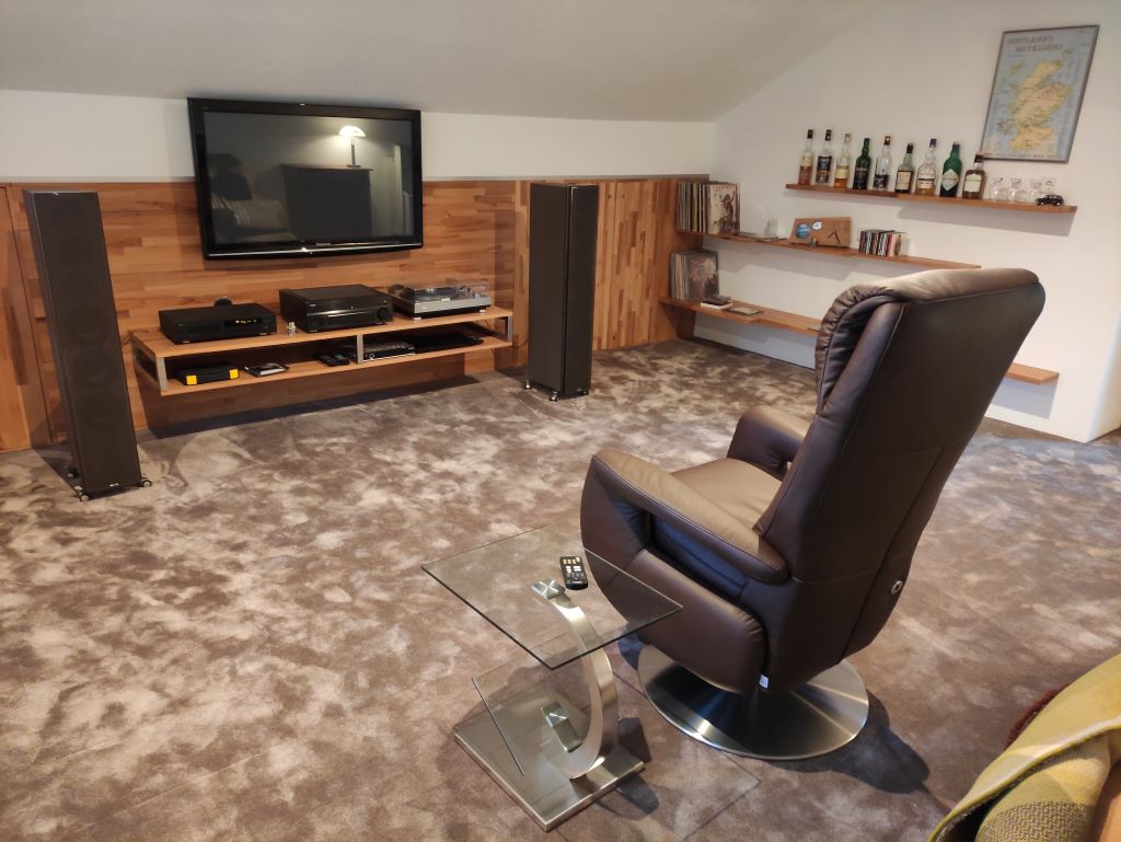 Danke danke, dämmen hat sich wahrscheinlich mit dem dicken Teppich schon erledigt. Hinter dem Sessel, ca. 2m steht noch ein Sofa unter der Dachschräge. Erst dort habe ich ganz leichte Bassmoden. Am Hörplatz empfinde ich alles nahezu perfekt. Muss mich erst noch eine Weile einhören. Abstand der 110er zur Rückwand sind 40cm und zur Seite ist eh genug Platz. Irre ist die Räumlichkeit. Auf der Nubert CD, vorletztes Lied, Trompete und Orgel in einer Kathedrale aufgenommen klingt als wäre man mitten drin.