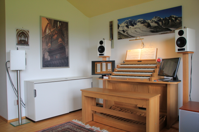Seit einiger Zeit werde ich an der Orgel von 4 Stück nuPro A-300 in 4.1 beschallt (siehe auch meine Bildergalerie), außerdem verschönt ein zweiter Absorber mit der Orgel in Hereford den Raum, für Ordnung sorgt ein Notenschrank.