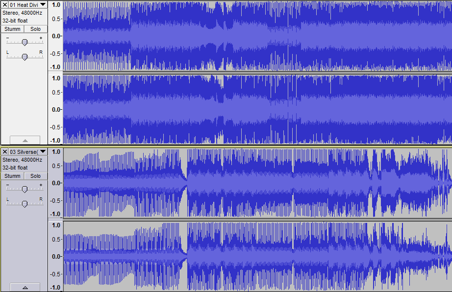 Audacity konnte das MP3 öffnen und zeigt auch was an, und die Lieder sehen unterschiedlich aus, aber als Laie kann ich da leider nichts raus lesen. => Es ist das "untere" Lied (Silverse) bei welchem der Bass an der Haupthörposition verschluckt wird.