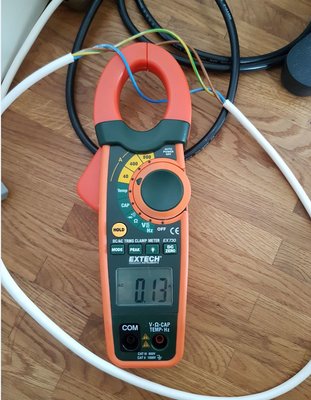 Kontrolle mit Multimeter ergibt weniger als 0,15 A Strom bei 231 V Netzspannung. Leider liegt der gemessene Strom im Bereich des Messfehlers vom Multimeter.