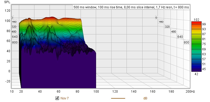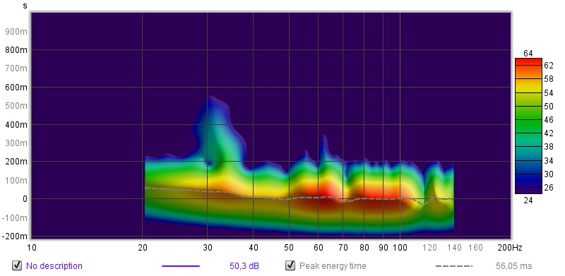 der Nachhall sieht nur wegen der Skalierung so harmlos aus, die Hauptmode bei 33Hz läuft eher 600ms für -30dB